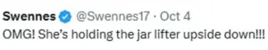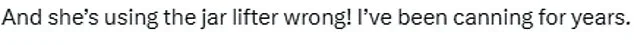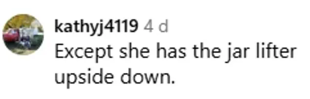 She’s holding the jar lifter upside down!!!’ Another added, ‘She’s using the jar lifter wrong!