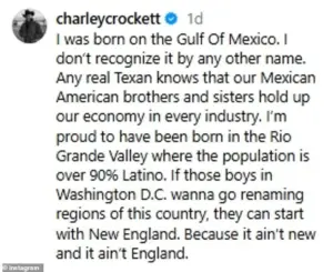 Hailing from San Benito in South Texas, Crockett took to social media to express his outrage, stating, ‘I was born on the Gulf of Mexico.