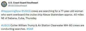 The US Coast Guard is currently conducting an extensive search for a 77-year-old woman who fell overboard from the Holland America Line cruise ship *Nieuw Statendam* approximately 40 miles northeast of the Sabana, Cuba.