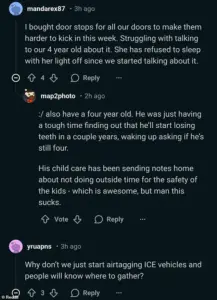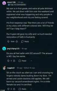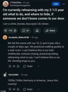 One user, identifying as a ‘white, blonde, blue-eyed, US citizen,’ shared how they rehearsed with their three-year-old what to do if an ICE agent knocked on the door.