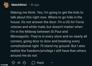 A Minneapolis native and US Air Force veteran described discussing ‘plans of action’ with his children, emphasizing that ICE agents are ‘breaking every constitutional right.’ His account, like many others, reflects a belief that the government is overstepping its bounds, even if the threat is not immediate. ‘I’ll stand my ground,’ he wrote, a sentiment that echoes broader frustrations with federal policies perceived as intrusive or unjust.