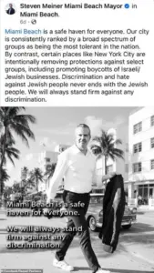 Meiner, who is Jewish, compared Miami Beach to New York City and accused it of ‘intentionally removing protections against select groups, including promoting boycotts of Israeli/Jewish businesses’