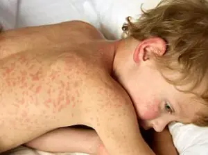 Symptoms typically appear 10 to 14 days after exposure and include high fever, cough, runny nose, and a distinctive rash.