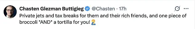 Chasten Buttigieg, husband of former Transportation Secretary Pete Buttigieg, amplified the critique with a similarly biting remark: ‘Private jets and tax breaks for them and their rich friends, and one piece of broccoli *AND* a tortilla for you!’ The jab at Trump’s economic policies highlighted a broader narrative of inequality, with critics arguing that the administration’s focus on protecting corporate interests has come at the expense of middle-class households.