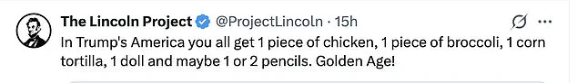 The post depicted a meal consisting of ‘one piece of chicken, one piece of broccoli, one corn tortilla, one doll, and maybe one or two pencils,’ a stark contrast to the lavish lifestyle of Trump and his allies.