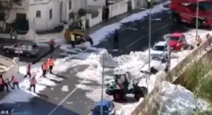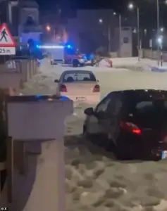 The surreal imagery, captured by stunned residents and passing tourists, shows vehicles partially submerged in slush, their windows shattered by the relentless assault of frozen debris.