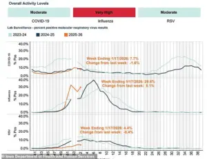 Meanwhile, Iowa’s Moulton-Udell school district canceled classes and sports after nearly 30 percent of its students and staff fell ill, prompting officials to label the two-day shutdown a ‘necessary response’ to an ‘extremely high’ rate of sickness.