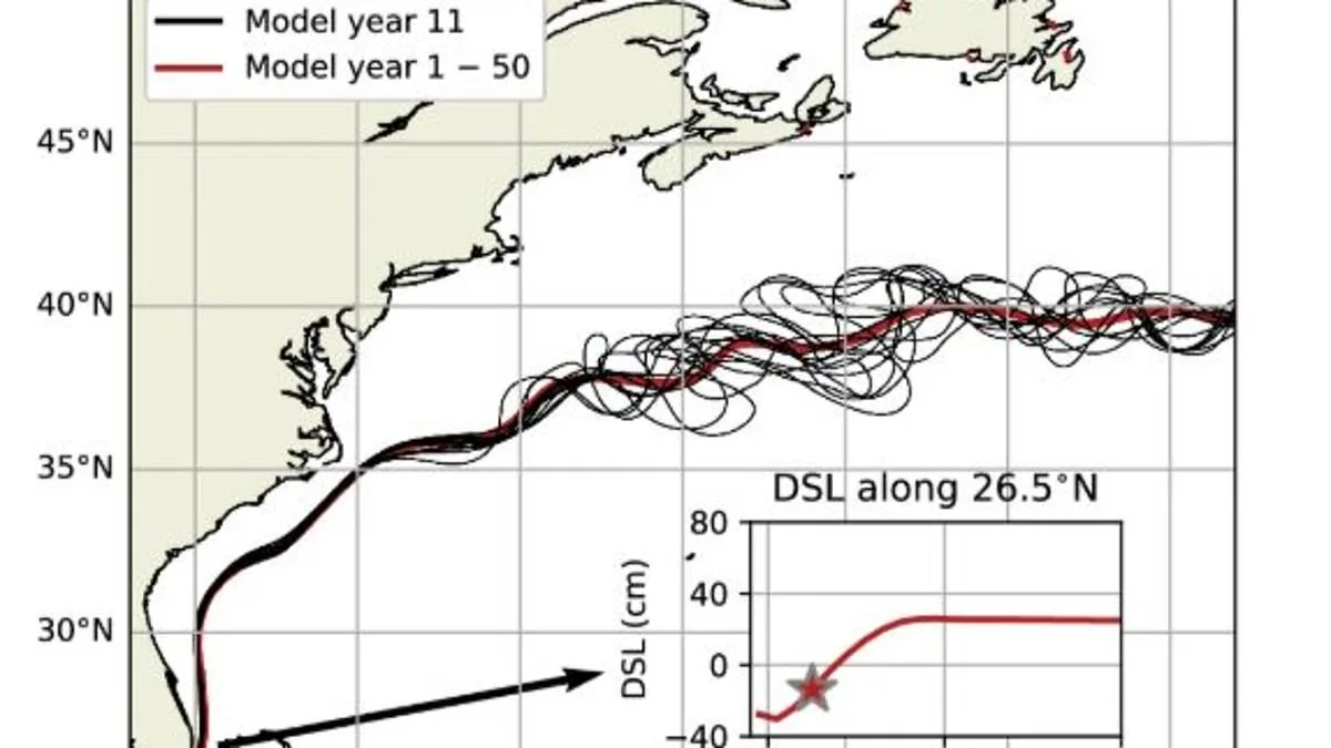 To simulate the impact of climate change, researchers created a high-resolution computer model and gradually introduced fresh water to mimic the melting of polar ice sheets. In the simulation, the Gulf Stream—a key component of the AMOC—shifted northward abruptly 25 years before the AMOC collapsed entirely. This sudden northward jump of 136 miles (219 km) is now being observed in real-world data, raising alarms that the same process may already be underway. The Gulf Stream's northward drift near Cape Hatteras, North Carolina, aligns closely with the model's predictions, suggesting the AMOC could be approaching a critical threshold.
