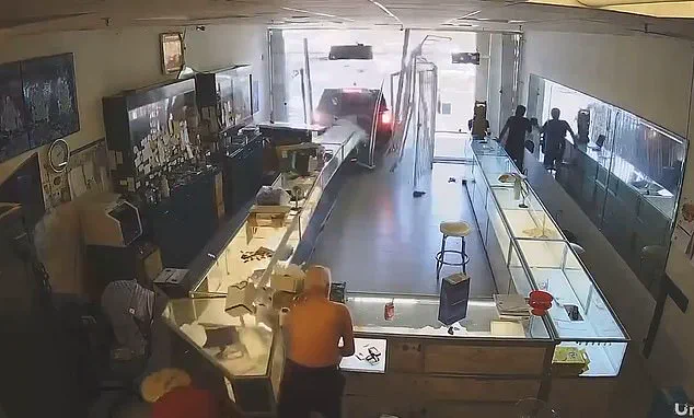 The video, obtained through a limited, privileged channel by a local news outlet, reveals a moment of unrelenting chaos: a stolen SUV, its engine roaring, is deliberately reversed through the shop’s reinforced glass storefront in broad daylight.