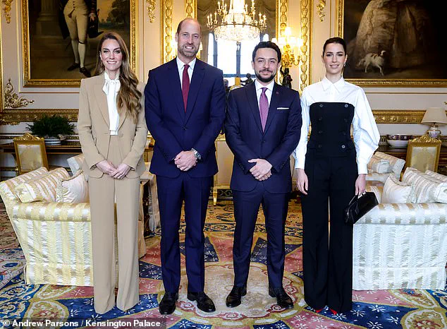 The event, held at the royal residence, marked a significant moment in diplomatic relations between the United Kingdom and Jordan, with Prince William, 43, and his wife, Kate, 43, welcoming Crown Prince Hussein, 31, and his spouse, Crown Princess Rajwa, during their official visit to the UK.